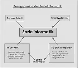 Formal zählt die Sozialinformatik als Bindestrich-Disziplin. Das bedeutet zunächst, dass eine grundlegende Disziplin einen speziellen Fokus erfährt. Im Rahmen der Sozialinformatik wird üblicherweise die Informatik als grundlegende Disziplin in Bezug auf die Felder der sozialen Arbeit betrachtet.[Zitat 2] „Es stellt sich allerdings die Frage, ob es zur Nutzung neuer Technologien in der Sozialen Arbeit der Begründung einer eigenen Sozialinformatik bedarf“.[8] Betrachtet man nämlich die inhaltliche Besetzung des Begriffs Sozialinformatik genauer, so hat diese im Grunde sehr wenig mit dem eingeführten Begriff der Informatik zu tun. Es handelt sich also meist nicht um eine angewandte Informatik auf dem Gebiet der sozialen Arbeit. Das hat unter anderem damit zu tun, wie man Technik, Informatik und Soziale Arbeit grundsätzlich versteht.