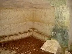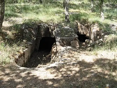 Die Grabstätten wurden hauptsächlich in Ost-West-Richtung ausgerichtet.[9] Sie sind unterschiedlicher Größe, bei den beiden größten Grabkammern arbeiteten die Erbauer einen mittleren beziehungsweise zwei an den Wänden befindliche Pfeiler aus dem Fels heraus, um die Kammerdecken zu stützen. Das größte der Gräber befindet sich am Südende des umzäunten Geländes. Es besitzt einen Dromos von 16 Metern Länge und eine quadratische Grabkammer mit 5 Metern Seitenlänge. Das Grab unterscheidet sich von anderen durch eine umlaufende, aus dem Fels herausgearbeitete Steinbank.[7]