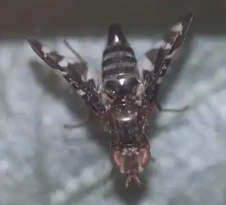 Die Fliegen erreichen eine Körperlänge von 6–7 mm.[1] Der Kopf ist auf der Unterseite gelb gefärbt. Der Thorax ist blassgrau mit drei schwarzen Längslinien.[1] Die Fliegen besitzen eine markante artspezifische Flügelzeichnung. Die transparenten Flügel weisen eine breite braune Zickzack-Musterung auf.[1] Der schwarze Hinterleib ist leicht behaart. Er ist bei den Männchen schlank, während er bei den Weibchen verbreitert ist. Die Weibchen besitzen einen kurzen Legebohrer. Die zylindrischen weißen Larven erreichen eine Länge von 7–9 mm.[1]