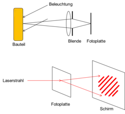 Das zu untersuchende Objekt (z. B. ein Bauteil) wird mit Licht hinreichender Kohärenzlänge beleuchtet und mit einer Linse auf eine Fotoplatte abgebildet, siehe oberes Bild der Abbildung. In der Bildebene (Fotoplatte) entsteht ein mit Speckles überlagertes Bild des Objekts.[2] Die Specklegröße wird dabei durch die Blendenöffnung bestimmt.