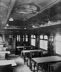 Die ersten deutschen Speisewagen wurden von der Internationalen Schlafwagengesellschaft (Compagnie Internationale des Wagons-Lits, kurz CIWL) durch Umbau einiger drittklassiger Wagen der Berlin-Anhalter-Eisenbahn improvisiert und ab dem 1. Juli 1880 zunächst zwischen Weimar und Bebra, dann zwischen Berlin und Bebra eingesetzt.[19] Die Küche zur Speisenzubereitung befand sich nicht im eigentlichen Speisewagen, sondern in einem nachfolgenden Gepäckwagen.[20]