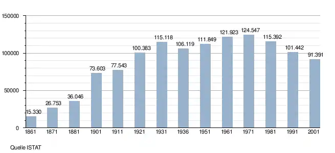 Die demografische Entwicklung bis Ende des 18. Jahrhunderts lässt sich nur schätzen. Für die Zeit zwischen 1500 und 1800 ist es realistisch, von einer langsam ansteigenden Population zwischen mehreren Hundert und mehreren Tausend Einwohnern auszugehen. Das Istituto Nazionale di Statistica hat die demografische Entwicklung seit Mitte des 19. Jahrhunderts in Zahlen erfasst. Die Entwicklung dokumentiert das rasante Wachstum im 19. Jahrhundert, zeigt in der zweiten Hälfte des 20. Jahrhunderts allerdings einen langsamen Bevölkerungsrückgang. Die aus dem Jahr 2009 stammende Einwohnerzahl von rund 95.000 deutet auf eine Konsolidierung hin.