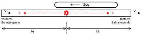 Angenommen, der Anfang des Zuges (vgl. Einsteins Gedankenexperiment) löst beim Passieren des vorderen Bahnsteigendes einen Lichtblitz aus und das Ende des Zuges beim Passieren des hinteren Bahnsteigendes ebenso.