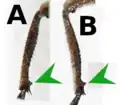 | Abb. 4: A Schiene des mittleren Beinpaars, B Schiene des Hinter- beins, jeweils von unten, Pfeil- spitze auf Zahn nahe dem Schienenende |