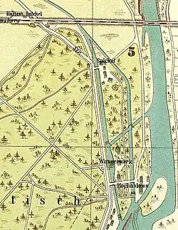 Die Spickel-Gaststätte 1904. Links im Bild hinter der Brücke Waggons eines Zuges auf der nahe gelegenen Bahnstrecke München–Augsburg. -
