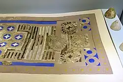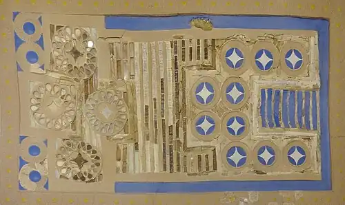 Das „Spielbrett“ aus Elfenbein bildete wahrscheinlich die Oberseite eines hölzernen Kastens. Es ist mit Einlagen aus Bergkristall und Lapislazuli-blauem Glas versehen sowie teilweise mit Gold- und Silberfolie überzogen. Als Rahmen dient die Darstellung von 72 Margeritenblüten. Auf der einen Seite sind vier große, kreisförmige Medaillons kreuzförmig angeordnet, deren Außenseiten je ein Paar gegenläufiger Spiralen ausfüllen. Die Medaillons besitzen einen äußeren Schlaufenring aus Elfenbein mit silberunterlegten Glas- und Bergkristalleinlagen und im Kern je eine Raute mit eingezogenen Seiten. Zur anderen Seite der Medaillons schließt sich eine H-förmige Zone aus abwechselnd flachen Bergkristall- und gerundeten Elfenbein-Streifen an. Die Gegenseite des „Spielbretts“ wird von zehn kleineren Rautenkreisen ausgefüllt, aufgeteilt in eine zentrale Vierergruppe und zwei seitlichen Dreierreihen. Der Raum zwischen den vier letzten Kreisen der Dreierreihen besteht aus Elfenbein- und Bergkristall-Streifen.[5]