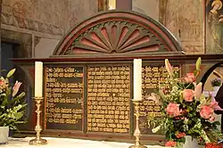 Im Mittelfeld die erhaben geschnitzten und vergoldeten Einsetzungsworte des Abendmahls in beiderlei Gestalt: „Der her Jesus in der nacht da / er verrathen ward nam er das / brot dancket und prachs und g / abs seinen iünger un sprach ne / mpt hin un(d) esset das ist mein leib d‘ / für eich gegebe(n) wirt solchs thut zu / meinem gedechtnus. Desselben / gleiche(n) nam er auch den kelch na / ch dem abendml un(d) dancket un(d) / gab in den und sprach Trincket al / le daraus das ist mein blut des newen testaments welches für euch un(d) / für vil vergossen würt zur vergebu / ng der sunden Solchs thut so oft irs trinckt zu meinem gedechtnus.“