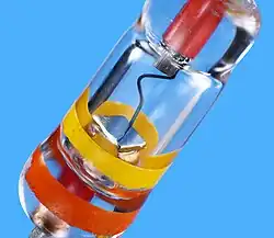 - CS3A mit Uf = 0,2 V bei 1 mA (fc ca. 10 GHz, Patronenform, Material: Silizium, Fa. British-Thomson-Houston Co Ltd. 1941).
