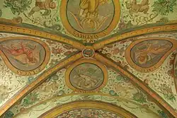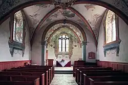 Das niedrig gehaltene Kirchenschiff wird mit einem Kreuzgurtgewölbe abgeschlossen. Im Jahr 1612 wurde die Kirche mit frühbarocken Malereien ausgeschmückt. Diese Ausstattung wurde 1930 im Rahmen der Renovation der Kirche wiederentdeckt und hervorgeholt. In den Fensternischen sind die Vierzehn Nothelfer dargestellt.[4] Die Kirche bietet rund 65 Personen Platz.[5]