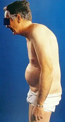 Bechterew-Kyphose. Der eingesteifte Thorax zwingt zur „Bauchatmung“ mit dem Zwerchfell