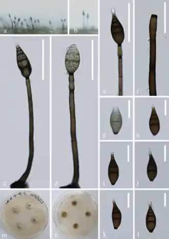 Sporidesmium lageniforme: a, b Kolonien auf Substrat. c, d Konidienträger mit Konidien. e Konidienträger. f konidiogene Zellen. g-i Konidien j Keimende Konidie. Kultur auf Kartoffel-Dextrose-Agar von oben (k) und unten (l). Messstriche: c-e 50 µm, f-l 20 µm | ||||||||||||