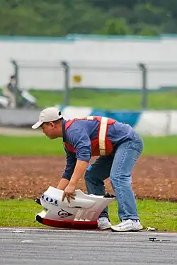 Der Sportwart an der Strecke, ist für die direkte Absicherung und Überwachung an der Rennstrecke zuständig. Er sichert Unfallstellen vom Streckenposten aus durch Flaggenzeichen ab, meldet Unfälle oder Regelverstöße an die Rennleitung und hilft in Gefahrensituationen, bei der Feuerbekämpfung und bei der Bergung von Fahrzeugen und Fahrern.[4] Er ist meistens auch für die Überwachung der Streckenbeschaffenheit seines Abschnitts verantwortlich und reinigt in den Rennpausen mit Abstreumittel und Besen die Strecke.