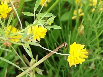 Die zwittrige Blüte ist zygomorph und fünfzählig mit doppelter Blütenhülle. Der Kelch ist fünfnervig, die unteren Kelchzähne sind mehrfach länger als die oberen und dabei doppelt so lang wie die Kelchröhre. Die Krone ist 5 bis 7 Millimeter lang, gelb und wird nach der Anthese hell-braun. Die Fahne ist löffelförmig, hat einen flachen Rücken und schwache Seitennerven.[2] Die Flügel sind spreizend. Der Fruchtknoten ist gestielt.