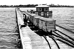 Wenn der Sprengstoff in andere Häfen verschifft werden sollte, wurden die Sprengstoffkisten mit der Schmalspurbahn zu an der 493 m langen Pier festgemachten Leichtern gebracht. Die speziell konstruierten motorlosen Schiffe wurden von Schleppern vom Anlegesteg zu ihren Liegeplätzen bei Williamstown geschleppt.[2] Von dort brachten die Leichter ihre Ladung auf Spezialschiffe, die an besonders verankerten Sprengstoff-Bojen in der Port Phillip Bay festgemacht wurden.