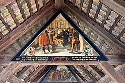 In den Giebelfeldern der Spreuerbrücke befinden sich heute noch 45 von ursprünglich 67 bemalten Holztafeln mit einem einzigartigen Totentanz, ausgeführt in den Jahren 1626 bis 1632 unter der Leitung des Malers Kaspar Meglinger. Es ist der umfangreichste und zugleich der öffentlichste aller bekannten Totentänze. Die dreieckigen Bildtafeln zeigen in der Regel unten links die Wappen der Stifter und rechts die Frauenwappen der Stiftergeneration. Auf den schwarzen Holzrahmen stehen erläuternde Verse und die Namen der Stifter (Bildmenge). Auf den Bildern sind auch Portraits der Stifter und weiterer Vertreter der Luzerner Gesellschaft zu sehen. Die Luzerner Maler haben die Bilder des Todes von Hans Holbein d. J. gekannt und auch Anregungen daraus übernommen; aber ihre Darstellungen sind bereits fortschrittlicher in der Malweise. Bilder und Texte der Luzerner Totentafeln sollen deutlich machen, dass es keinen Ort in Stadt und Land und auf dem Meer gibt, wo nicht auch der Tod präsent ist.[2]
