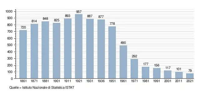 Der Bevölkerungsrückgang in den letzten Jahren ist nicht nur auf die Entvölkerung der Alpengebiete zurückzuführen, sondern auch auf einen Erdrutsch. Zwischen dem Jahr 1960 und 1965, als die drohende Gefahr eines großen Erdrutsches bestand, wurde die Gemeinde gezwungen einen Großteil der Bevölkerung für immer zu evakuieren.[2]