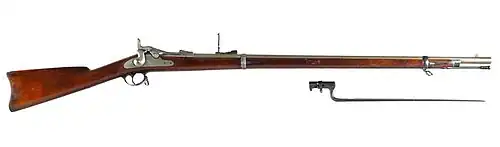- Das Infanteriegewehr mit 32 5/8-inch-Lauf (830 mm), Bayonnetthalterung, Vollschäftung und Tragriemen. Putzstock unter dem Lauf.
