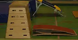 Die Sprungbretter im Turnsport dienen der Erhöhung des Sprungvermögens, beim Gerätturnen insbesondere bei den Disziplinen Sprung, Barren, Stufenbarren und Schwebebalken. Weit verbreitet ist das Reutherbrett, benannt nach seinem Erfinder, dem Turnsportler Richard Reuther.[2] Die Eigenschaften sind im Bereich der Fédération Internationale de Gymnastique vorgeschrieben.[3] Sie sind dort 1,20 m lang und 70 cm breit. Die Federwirkung wird durch Metall- oder Holzfedern erzielt. Die Sprungbretter sind mit rutschhemmenden Auflagen gepolstert. Sprungbretter bestehen aus Hartholz.