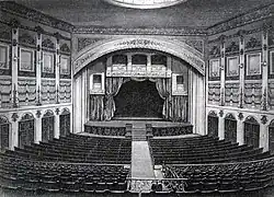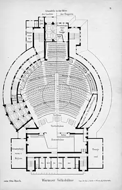 Es zeichnete sich durch den kreisförmigen Grundriss des Zuschauerraumes aus, in den die Vorderbühne (14 × 4,5 m)[13] hineinragte und damit von allen Stellen des Zuschauerraums eine gute Sicht gewährte. Umgeben war der Zuschauerraum von zwei Rängen.[6] Die Vorderbühne war abbaubar. Dann konnte das Haus als übliche „Guckkastenbühne“ bespielt werden. Den Raum der Vorderbühne konnte dann entweder ein kleines Orchester einnehmen oder es konnten dort zusätzliche Zuschauerplätze eingerichtet werden.[14] Die Bühnentechnik war einfach gehalten – auch um dem zeitgenössischen „Kulissenwesen“, worunter die Initiatoren die im Laufe des 19. Jahrhunderts fortschreitende Perfektionierung des Bühnenbildes und seine Annäherung an die Realität verstanden,[15] einen Reformansatz entgegenzusetzen. Gegenüber der Bühne, auf der Rückseite des Zuschauerraums, war eine Empore für einen Chor von 100 Sängern und eine Orgel eingebaut. Die Beleuchtung erfolgte über eine Laterne in der Kuppel des Zuschauerraums, entweder mit Tageslicht oder bei Dunkelheit mit elektrischer Beleuchtung. Das Haus hatte 1200 Sitzplätze.[16] Der Theaterbau wurde um einen Flügel mit Festsaal ergänzt, der sich entlang der Bahnhofsstraße nach Süden erstreckte.