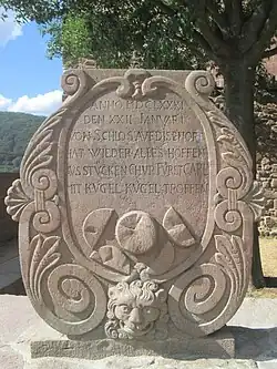 - „ANNO MDCLXXXI. DEN XXII JANUARI VON SCHLOS AUF DISEN ORT HAT WIEDER ALLES HOFFEN AUS STÜCKEN CHURFÜRST CARL MIT KUGEL KUGEL TROFFEN“