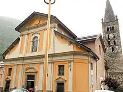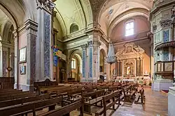 Die Kirche mit Querhaus ist barock mit klassizistischen Elementen. Von der Vorgängerkirche ist der gotische Chor erhalten. Der Kirchturm stammt aus dem 15. Jahrhundert. Das Innere der Kirche überrascht durch Weite und Vielfalt.[2] Die Orgel wurde 1829 von den Brüdern Agati gebaut und 1997 renoviert.