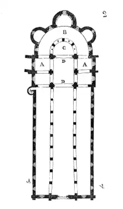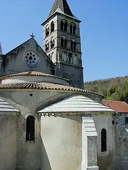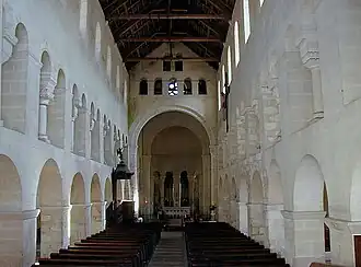 Die Kirche ist eine ungewölbte, querhauslose, dreischiffige Pfeilerbasilika mit Chorumgang und Kapellenkranz, in der Substanz im Wesentlichen aus der ersten Hälfte des 11. Jahrhunderts. Das Mittelschiff ist in der Hochwand dreiteilig gegliedert: Über den Arkaden liegen auf Pfeilern Scheinemporen (ihre Arkaden öffnen sich nicht zu begehbaren Emporen, sondern zu den Seitenschiffen) aus Doppelarkaden auf Säulen mit unterschiedlich gestalteten Kapitellen und Kämpferplatten, darüber die Obergaden. Diese Gliederung dient der „Entmassung“ der Wand und ist präformativ für die französische Gotik. Vergleichbar sind hier die Abteikirchen von Saint Rémi in Reims und Montier-en-Der, beide in der Champagne. Frappierend ist die Ähnlichkeit zur späteren Abteikirche Sant’Antimo in der Toskana, die sowohl Grund- und Aufriss als auch den Außenbau betrifft. Derartige Scheinemporen sind lediglich aus der Kirche Notre-Dame de Châtel-Montagne in der Region Auvergne bekannt.