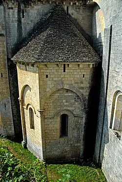 Die Giebelwände des Querhauses sind stufenförmig über die Dachflächen hinausreichend hochgeführt, die Giebelwand des Chors reicht ohne Stufung bis über die Firsthöhe. Die nördliche polygonale Querhauskapelle besitzt nur unstrukturierte Wandflächen mit einfachen Graten auf den Ecken. Die südliche Querhauskapelle ist auf den Ecken mit Rundsäulen ausgestattet, auf denen Blendarkaden aufliegen.