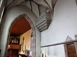 Der Chor wird von einem Netzgewölbe überwölbt. Ein spitzbogiger Triumphbogen bildet den Zugang zum Chor. Auf der Nordseite sitzt hoch oben eine Patronatsloge auf einer vielfach profilierten Konsole. Eine Steinbrüstung mit Maßwerk schützt die Besucher. Auf der westlichen Stirnseite sitzt eine hölzerne Orgelempore auf zwei schmalen Rundsäulen.