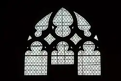 Der Chor ist gerade geschlossen. Er wurde ursprünglich von zwei Fenstern beleuchtet, die heute vermauert sind. Die Rosette wurde 1957 erneuert.