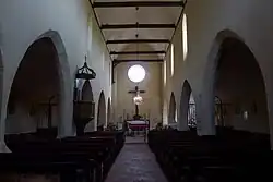 Das Langhaus ist dreischiffig und in fünf Joche gegliedert. Breite spitzbogige Arkaden öffnen das Hauptschiff zu den beiden Seitenschiffen.