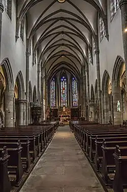 Profilierte Spitzbögen trennen Mittel- und Seitenschiffe. Getragen werden diese in einem Stützenwechsel aus Rundsäulen und Pfeilern. Aus diesen erwachsen halbrunde Dienste, die die Kreuzrippengewölbe tragen. Über den Rundsäulen tragen Konsolen die Gewölbe. Auf der westlichen Stirnseite sitzt eine barocke Holzempore mit Orgel.