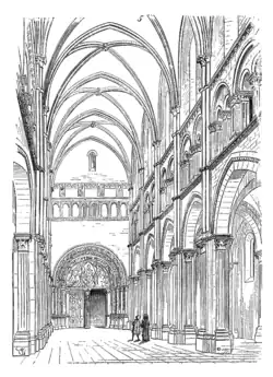 In Fortsetzung der Pilaster des Erdgeschosses sind im zweiten und dritten Geschoss den Pfeilervorlagen zwei nebeneinander stehende halbrunde junge Dienste vorgeblendet, die von gemeinsamen skulptierten Kapitellen gekrönt werden. Auf ihnen stehen im Querschnitt rechtwinklige und scharfkantige Gurtbögen, die das Tonnengewölbe in vier Abschnitte unterteilen.
