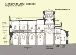 St-Hilaire ist eine dreischiffige Basilika, mit einem vierjochigen Langhaus in dem typischen dreigeschossigen Cluny-Aufriss, danach folgen ein kaum ausladendes Querhaus und ein dreischiffiges Chorjoch mit drei Apsiden.