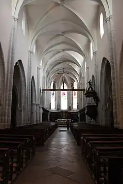 Der dreischiffigeLanghaus ist in fünf Joche gegliedert und wird von Kreuzrippengewölben gedeckt. Hohe Spitzbogenarkaden, die auf mächtigen Pfeilern aufliegen, öffnen das Hauptschiff zu den Seitenschiffen. Der zweijochige Chor endet in einer polygonalen Apsis.