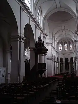 Das vierjochige, zweigeschossige Hauptschiff ist mit Rundbogenarkaden versehen und wie die Seitenschiffe mit schlichten Tonnengewölben bedeckt, in welche tiefe Stichkappen für die hohen, rundbogigen Obergadenfenster eingelassen wurden. Eine Kuppel überwölbt die Vierung, Tonnengewölbe mit Stichkappen die Querhausarme. Der lange, schmale Chor mit drei geraden Jochen im gotischen Stil und einer fünfteiligen Apsis ist von einem engen Deambulatorium und Kapellen umgeben. Sowohl der Chorumgang als auch die Kapellen sind jeweils von einem einzigen Kreuzrippengewölbe bedeckt. Die der Jungfrau Maria geweihte rechteckige Scheitelkapelle schließen zwei mit Halbkuppeln gewölbte Apsiden ab. Die hier befindlichen Wandmalereien führte Auguste-Barthélemy Glaize im Jahr 1868 aus.