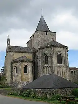 Über der Vierung erhebt sich der gedrungene, quadratische Glockenturm, der mehrfach erneuert wurde. In der zweigeschossigen und durch Strebepfeiler gegliederten Apsis öffnen sich oben fünf von Archivolten und schlanken Säulen gerahmte Rundbogenfenster. Unter den mittleren drei Fenstern verläuft jeweils eine Reihe von vier hohen Blendarkaden, die auf Pilastern aufliegen, deren Kapitelle mit Blütenknospen, stilisierten Blättern und einem Stierkopf verziert sind. Die Arkadenbögen sind wie die Pilaster mit Knospen verziert. Die Kragsteine unter dem Dachansatz sind vor allem mit unterschiedlichen Tier- und Menschenköpfen skulptiert. Querhaus und Chor sind mit Kalksteinplatten gedeckt.