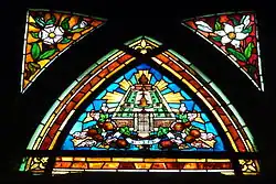 Das zentrale Fenster der Apsis wurde 1906 von Léon Tournel geschaffen und stellt die Kreuzigung Christi dar. Zu beiden Seiten des Kreuzes stehen Maria und der Apostel Johannes, der Lieblingsjünger Jesu. Am Fuß des Kreuzes kniet Maria Magdalena. Auf der rechten Seite würfeln Soldaten um die Kleider Jesu. Auf den unteren Fenstern wird – umgeben von den vier Wesen der Apokalypse – das Lamm Gottes auf dem Buch mit sieben Siegeln dargestellt.
