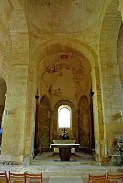 Der Triumphbogen zwischen Vierung und Chor hat die gleiche Dimension wie die übrigen Vierungsbögen. Der Chorraum inklusive halbkreisrunder Apsis ist 5,80 m breit und 7,90 m lang. Der erste Abschnitt ist mit einer Tonne überwölbt, an die im Bereich der Apsisrundung ein Gewölbe in Form einer Kalotte unmittelbar anschließt. Die Chorwölbung erhebt sich über einem Kranz von sieben Blendarkadenbögen, die sich auf sechs schlanken zylindrischen Säulen mit skulptierten Kapitellen abstützen. Bei diesen Schmuckelementen könnte es sich um eine spätere Zutat handeln. Das einzige Fenster im Zentrum der Apsis besitzt nicht mehr seine ursprünglich kleinere Dimension, aber immerhin einen Rundbogen.