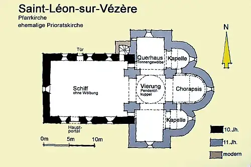 Das Hauptschiff aus der Vorromanik besticht durch seine klaren Proportionen des einfachen Saales ohne jegliche Unterteilung in Schiffe und Joche. Seine Breite beträgt 12,85, seine Länge 15,20 Meter und sein lichte Höhe gut 8,00 Meter. Die einzigen Accessoires der Seitenwände bilden jeweils drei Fenster, die mit ihren Rundbögen fast gegen die Decke stoßen. Ihre Gewände sind allseitig abgeschrägt. Auf der Südwand befindet sich das Hauptportal und auf der Nordwand eine zweite, aber kleinere Tür. Die westliche Giebelwand verzichtet auf ein Portal, weil dort die Böschung des Ufers der Vésère anschließt. Diese Wand weist lediglich ein Fenster auf, etwas größer und in Höhenlage der Fenster der Schiffseiten.