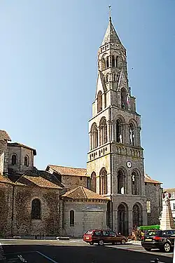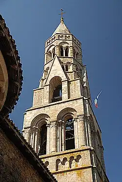 Der spätromanische 52 Meter hohe Glockenturm ist eine Schöpfung des frühen 12. Jahrhunderts und wird in deutschsprachigen Kunst-Reiseführern „als vielleicht der eleganteste seiner Stilrichtung im Limousin“ beurteilt. Er steht mit seinem fast quadratischen Grundriss auf der Nordwand im 3. Joch des Langhauses und berührt auf seiner Ostseite die westliche Kapellenapsis der Grabeskapelle. Er öffnet sich allseitig in allen Geschossen mit großzügigen Wanddurchlässen, mit fast unmerklich angespitzten Rundbögen, ausgenommen nach Süden in den beiden unteren Geschossen, in denen das Langhaus anschließt. Die Bauwerkskanten der unteren drei Geschosse sind durch kräftige Rückversätze gebrochen.