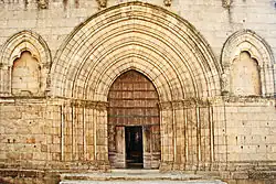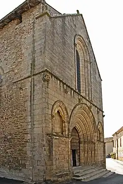 Der Westgiebel des Langhauses hat erst im späten 13. Jahrhundert, nach der Blütezeit der Pilgerfahrt nach Santiago de Compostela, die Vormauerung einer repräsentativeren frühgotischen Fassade erhalten. Das Natursteinmauerwerk besteht aus großformatigen, glatten, hellgrauen bis leicht beigefarbenen Werksteinquadern, die in regelmäßigem Schichtenverband vermauert sind. Die Portal- und Fenstergewände sind aus dem gleichen Material. Der neue Giebel übernimmt nicht die Höhe und Neigung des alten Langhausgiebels, dessen Ortgänge die Neigung des Satteldaches aufweisen. Seine Ortgänge weisen Neigungen um 45 Grad auf. Deren leicht auskragende Abdeckplatten knicken an den unteren Enden ein kurzes Stück waagerecht ab. Der Giebelfirst überragt deutlich den alten Dachfirst, hingegen schauen die unteren Teile des alten Giebels bis zu etwa einem Meter Höhe hinter dem neuen hervor.