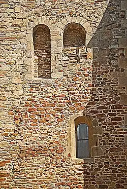 Vormauerung einer neuen Fassade (westliche Wand des Langhauses) mit einem großen Archivoltenportal, flankiert von zwei Blendarkaden und überdeckt von einem großen Archivoltenfenster.