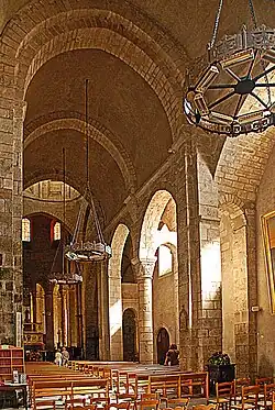 Das Langhaus ist in fünf teils unterschiedlich breite Joche unterteilt und weist in den Jochen 4 und 5 den Aufriss einer Pseudobasilika auf, ohne durchfensterte Obergaden, aus dem Mittelschiff und sehr schmalen Seitenschiffen, letztere etwa in Höhe der Gewölbeansätze des Mittelschiffs. Diese zunächst etwas verwirrende innere Aufteilung geht darauf zurück, dass zunächst das Langhaus aus einem einzigen Schiff bestand, ohne Steingewölbe. Die schlanken Außenwände hätten in der Spannweite ohne zusätzliche Verstärkungen keine steinernen Einwölbungen erlaubt.