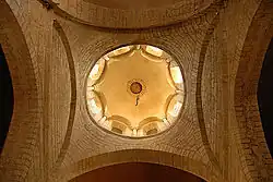Der Vierungsumriss ist nicht ganz quadratisch, sondern erweitert sich nach Osten geringfügig. Die Vierung wird von vier Arkaden mit angespitzten Rundbögen umgeben. Die zum Chor und zum Mittelschiff weisenden Bögen sind deutlich höher als die in der Querrichtung. Deshalb gibt es über den nach Süden und Norden weisenden Arkaden noch zusätzliche Blendarkadenbögen, über denen die Pendentifs der Vierungskuppel aufstehen. Bei dieser Pendentifkuppel ist zwischen dem unteren und oberen Teil der Kuppel ein achteckiger Tambour eingefügt, der aus dem Satteldach der Vierung als Laterne herausragt. Auf den inneren Tambourseiten ist jeweils eine rundbogige Blendarkade vorgeblendet, deren runde Säulchen in den Tambourecken stehen und von skulptierten Kapitellen und profilierten Kämpfern abgeschlossen werden. In den Nischen der Blendarkaden sind schlanke rundbogige Fenster ausgespart mit nach innen aufgeweiteten Gewänden. Im Scheitel der Kuppel ist eine kreisrunde Öffnung ausgespart, die von Keilsteinen eingefasst und von einem hölzernen Deckel verschlossen wird. Die beiden nach Osten weisenden Fenster werden von der dort aufragenden westlichen Chorraumwand verdeckt.