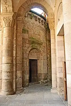 Das untere Geschoss bildet einen offenen Narthex (Portalvorbau), über den man sowohl in die Kirche, wie auch in die Grabeskapelle witterungsgeschützt gelangt. Es ist etwa gleich so hoch wie das nächste Geschoss, wirkt aber durch die deutlich größeren Arkadendurchlässe niedriger. Das Erdgeschoss wird oberseitig durch ein kräftiges umlaufendes Kraggesims abgeschlossen, das oberseitig nach außen abgeschrägt ist. Darüber treten die Wände des nächsten Geschosses etwas zurück. Die fast rundbögigen Arkadenpaare auf drei Turmseiten weisen im Bogenbereich beträchtliche Rückversätze der Gurtbögen auf, die von halbrunden alten Diensten getragen werden, welche mit pflanzlich und figürlich skulptierten Kapitellen und profilierten Kämpfern ausgestattet sind. Die Kämpfer umschließen auch die äußeren Pfeilerteile gänzlich als Kragprofil. Inmitten der acht Pfeiler, die das Quadrat des Narthex bilden, steht ein neunter Pfeiler, der mit vier Gurtbögen mit den anderen Pfeilern verbunden ist und selbst vier halbrunde Dienste mit Kapitellen und Kämpfern trägt. Die vier Deckenfelder sind mit Kreuzgratgewölben überdeckt. Einen mittleren Pfeiler findet man auch in den nächsten beiden Folgegeschossen.