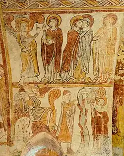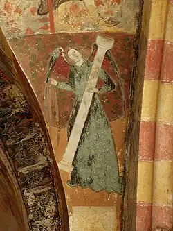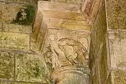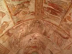 Die Kirche besitzt ein bemerkenswertes Ensemble romanischer Kapitelle, ein Glasfenster, das wahrscheinlich von vor 1165 stammt und die Abbildung Christi in der Glorie, umgeben von den Evangelistensymbolen zeigt[12][13], und Wandmalereien des 13. bis 16. Jahrhunderts.