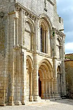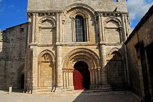 Die Kirche gehörte zum Tochterpriorat der Benediktinerinnen von Saintes. Dieser Umstand ließ die Verantwortlichen über ausreichende Mittel verfügen, die Fassade so üppig mit aufwändigster Skulptur der besten Steinmetze der Zeit auszustatten.