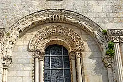 Die große Archivolte überdeckt mit etwas Abstand zum Archivoltenfenster das ganze Mittelfeld. Hier wird das Thema vom „Gleichnis der klugen und törichten Jungfrauen“ vorgetragen, eines der häufigsten in der romanischen Baukunst der Saintonge.
