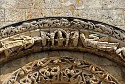 Das Hauptportal hat stirnseitig vier gestaltete Archivolten. Die innere Archivolte wird von elf Reliefs in Kreisringform geschmückt, darin je ein Engel mit ausgebreiteten Flügeln und erhobenen Händen, in radialer Anordnung.