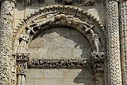 Von außen umfasst die große Archivolte ein zusätzliches auskragendes Band mit Skulpturen von tierischen Fantasiegestalten, begleitet von Ranken und Blättern. Die Kapitelle, deren Kämpfer und die Säulenbegleiter zeigen wieder tierische und pflanzliche Skulptur.